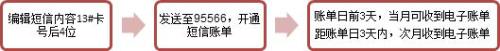 2.您可編輯手機(jī)短信13#卡號(hào)后4位,發(fā)送至95566,開(kāi)通短信賬單。