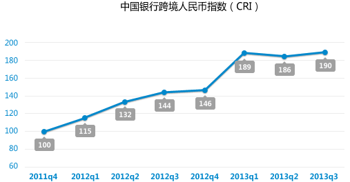 2013年11月7日,中國銀行在北京、香港、倫敦三地召開連線媒體發(fā)布會,發(fā)布2013年第三季度跨境人民幣指數(shù)。根據(jù)中國銀行公布的結(jié)果,第三季度跨境人民幣指數(shù)為190點,較第二季度小幅上升并再次創(chuàng)下歷史新高。